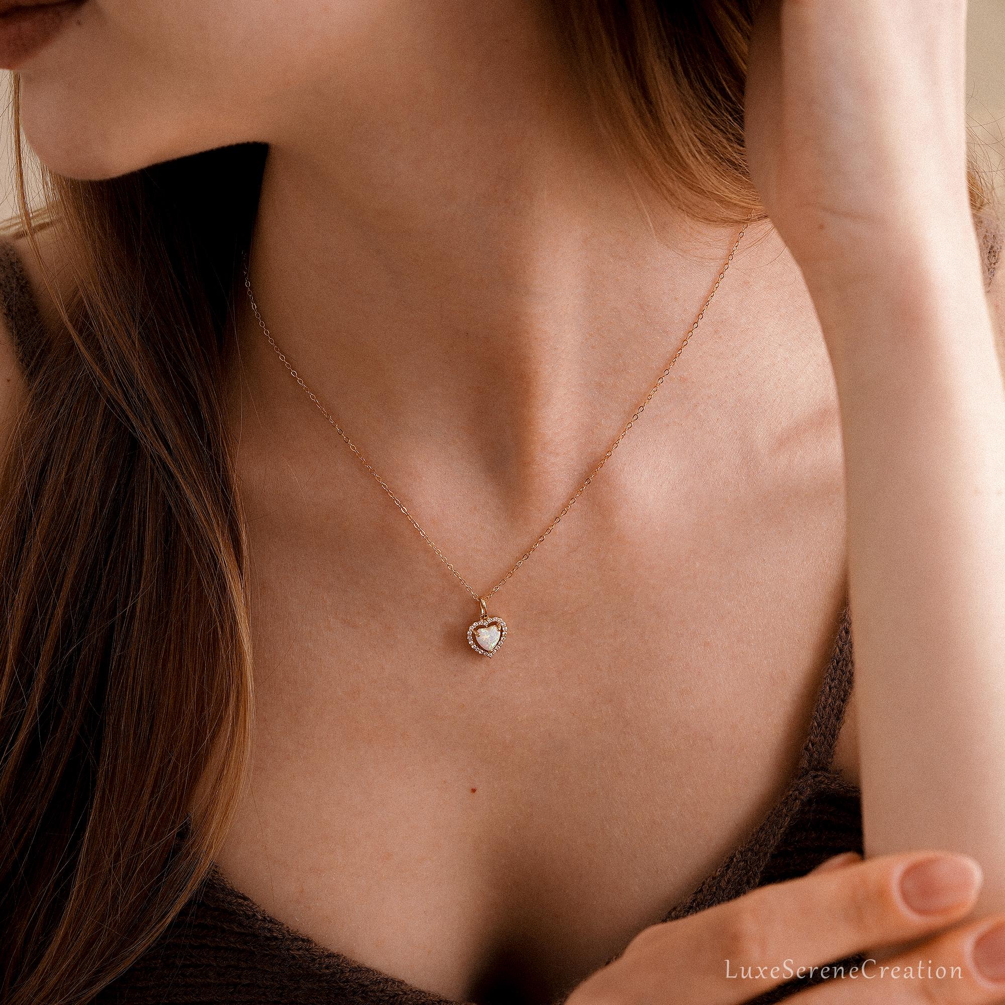 Dainty Opal Heart Necklace Minimalist White Delicate Love